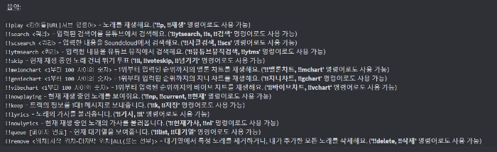 자주 쓰는 명령어!! p 노래검색,!! 검색 유튜브에서 듣고 싶은 노래 링크,!! 청소 이 정도로 간단하게 쓰고 있습니다.