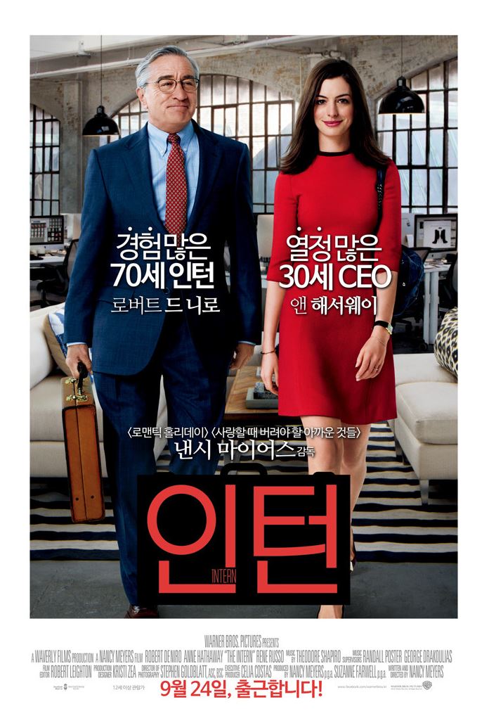 2015년 9월 24일 개봉한 코미디 장르로 지친 일상에 힐링을 주는 영화 인턴을 소개한다. 왓 위민 원트, 로맨틱 홀리데이, 사랑할 때 버려야 할 아까운 것들, 사랑은 너무 복잡해 등 주로 로맨틱 코미디를 연출했던 중년 여성 감독 낸시 마이어스가 각본을 집필하고 연출한 영화이다. 이번 작품은 전작들에 비하면 로맨스 요소나 코미디 요소가 많지 않다. 앤 해서웨이와 로버트 드 니로가 주연을 맡았다. 창업 1년 반 만에 직원 220여 명의 성공을 이룬 재능 있는 줄스(앤 해서웨이), 그에 맞는 패션 센스와 업무를 위해 사무실에서도 끊임없는 체력관리를 하고 야근하는 직원을 챙겨주며 고객을 위해 박스 포장까지 마다하지 않는 열정적인 젊은 여성 CEO가 수십 년의 직장 생활에서 얻은 노하우와 나이만큼 풍부한 인생 경험이 있는 70세의 벤(로버트 드 니로)을 인턴으로 채용하게 된다. 현재 취업시장에서의 나이 제한을 풍자하면서 전혀 불편하지 않게 풀어내었다는 것이 장점이라고 본다. 영화 인턴에서 다루는 이슈들은 우리 사회에서 흔히 볼 수 있는 부분이기 때문에 작품 요소에 대한 이해나 감정이입이 쉬운 편이다. 인생의 풍랑을 현명함으로 이겨내게 하는 삶의 지혜를 배울 수 있는 따뜻한 영화이다. 두 주인공의 뛰어난 연기력과 탁월한 비주얼은 보는 즐거움을 선사하였다.