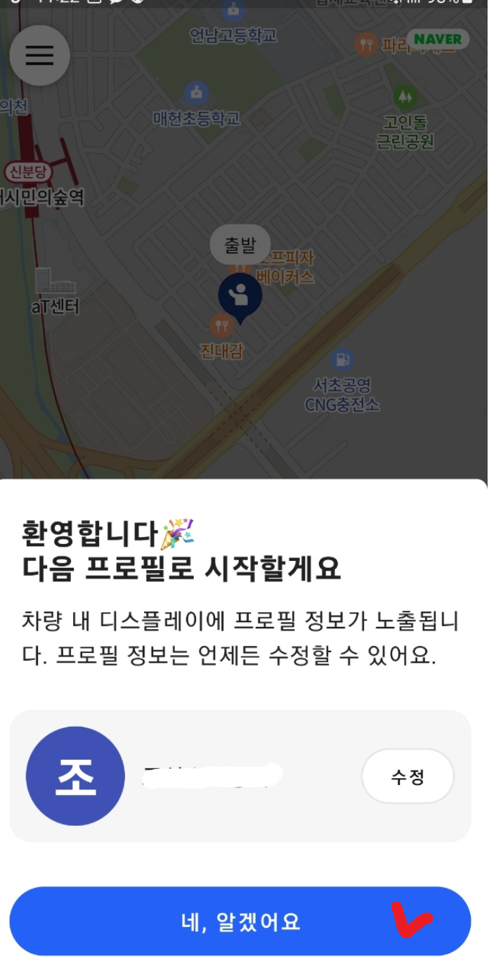 저는 카카오톡으로 로그인했습니다. 다음 화면으로 넘어가고 빨간 동그라미 화살표 눌러서 페이지 넘기면 환영한다는 창보입니다. 네, 알겠어요 눌러주세요.