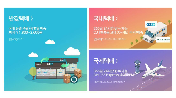 반값택배 | 0~500g 1,800원 ~1kg 2,200원 ~ 5kg 2,600 | 전국GS25 (제주도 및 도서지역 제외 | 접수일 포함 4일 이내(동일권역 2~3일 이내) | 세변의 합 80CM 이하, 무게 5KG 이하 |