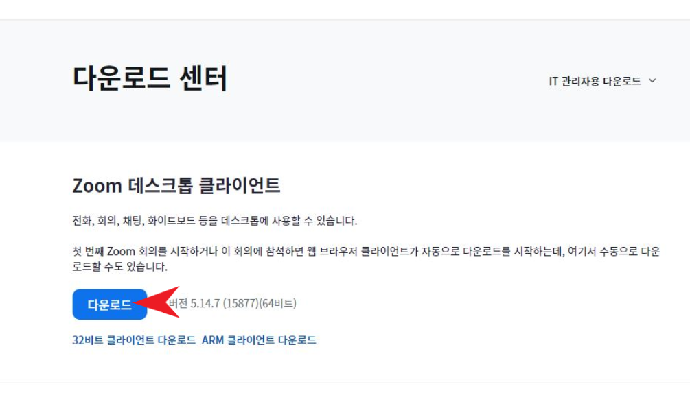 zoom 홈페이지에서 상단 라소스 메뉴에서 클라이언트 다운로드 센터 클릭