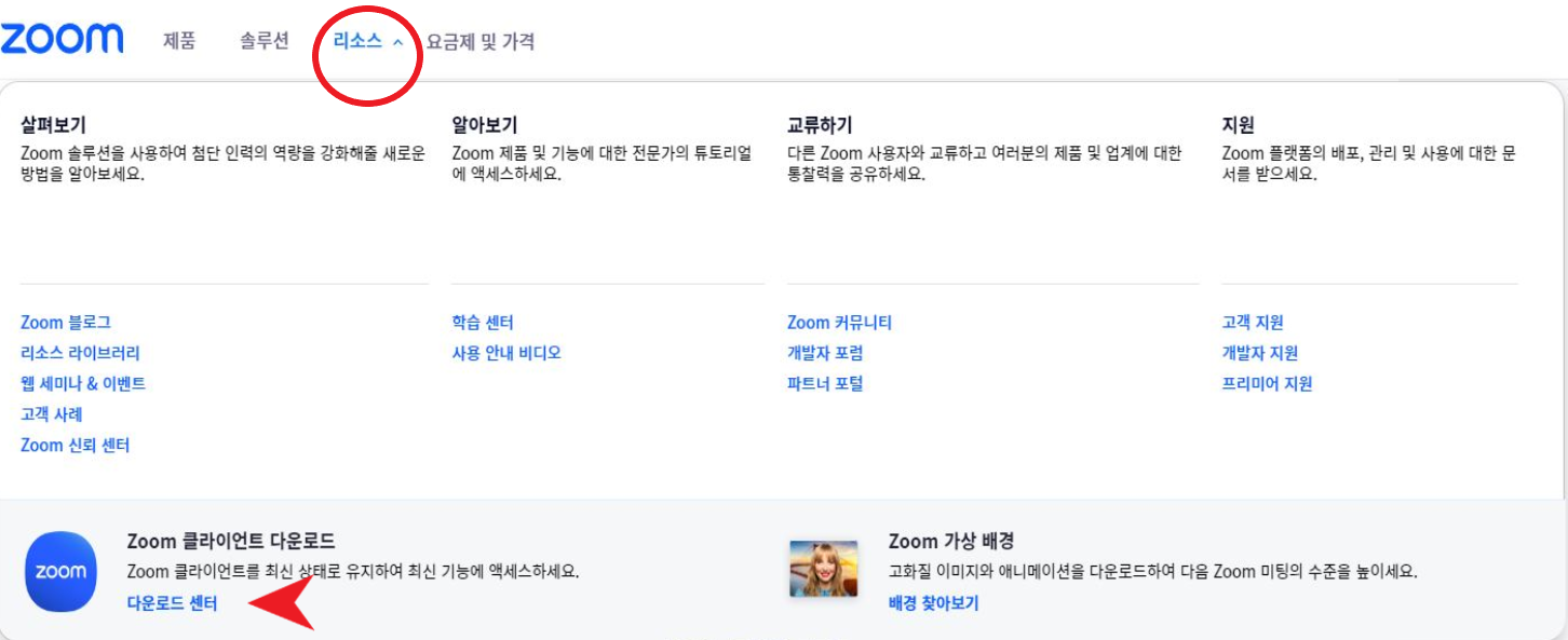 zoom 홈페이지에서 상단 라소스 메뉴에서 클라이언트 다운로드 센터 클릭