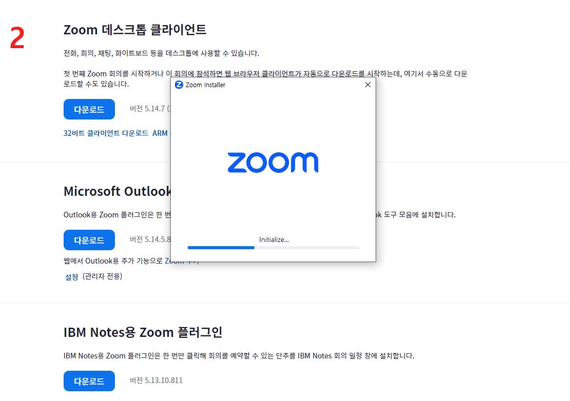 1번 좌측상단 파일 다운로드 클릭하면 2번 줌 다운로드 화면 나옵니다.