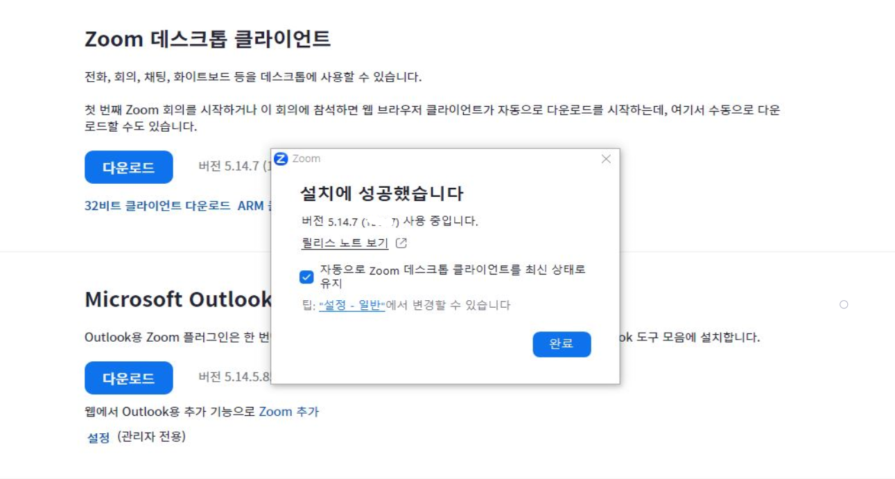 설치에 성공했다는 창이 뜨고 완료 클릭하면 zoom pc 배경 화면에 아이콘 생성 됩니다.